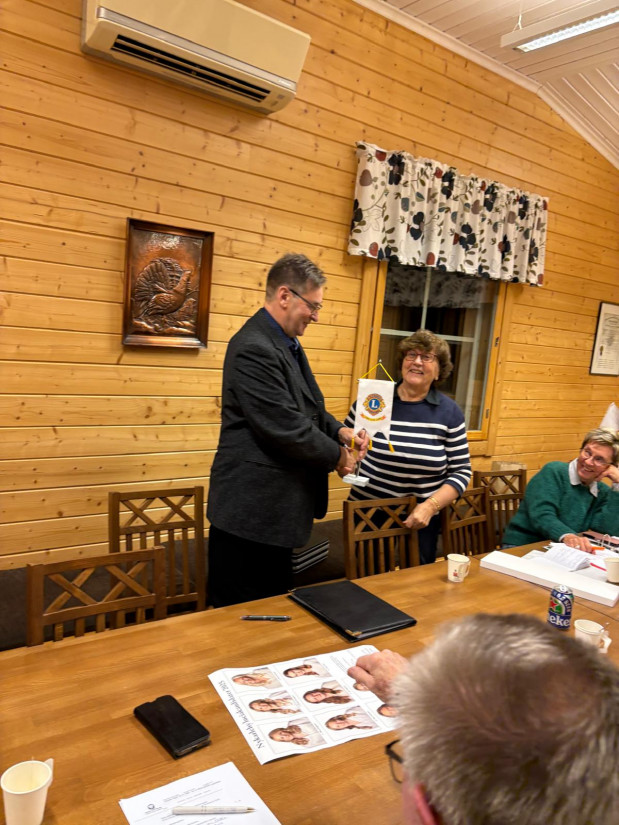 LC Jeppos standar överräcks av Marlene Lindgren till zonordf. Bjarne Tunis, LC Vörå.